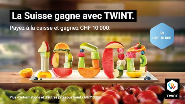 Si vous payez au moins cinq fois avec Twint à une caisse entre le 9 septembre et le 20 octobre 2024, vous participez automatiquement au tirage au sort pour gagner l’un des 5 prix de 10’000 francs ou l’un des 500 prix de 100 francs.